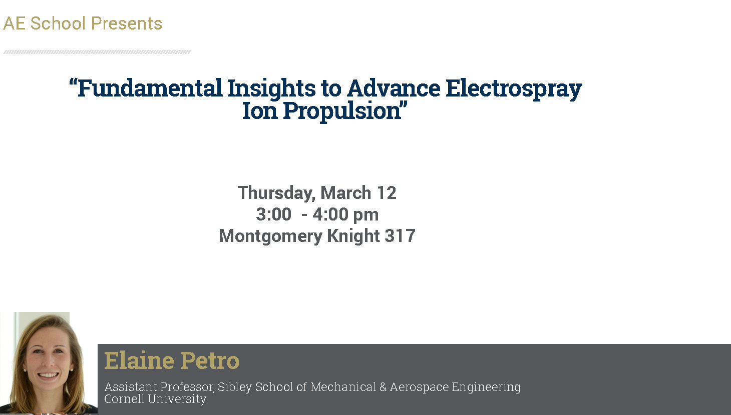 Elaine Petro is an Assistant Professor in the Sibley School of Mechanical and Aerospace Engineering at Cornell University. She is the director of ASTRAlab, a research lab focused on sustainable space propulsion and exploration architectures. Elaine completed her Ph.D. at the University of Maryland, in the Space Power and Propulsion Laboratory, studying water plasma chemistry in RF discharges. She also spent several years in the MIT Department of Aeronautics and Astronautics as a visiting student and post-doctoral researcher, studying electrospray thruster technology for small satellite platforms using both numerical modeling and experimental characterization. For her work on electrospray model development, Petro is the recipient of the 2023 Air Force of Scientific Research Young Investigator Program (YIP) award. Petro has been named an ARCS Scholar, National Science Foundation and Amelia Earhart fellow, and was recognized as one of Aviation Week & Space Technology’s Twenty20s emerging leaders in aerospace in 2016.