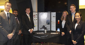We Have a Winner! "The Squirrel Works" takes home first place for an aerospace engineering project -and a check for $1,000: (from left) Erica Hulette, Emily Paxton, (back row) Wesley Gillman, Kyle Neville, Jared Mehnert, and Fahraan Badruddin. See the slideshow from the 2018 Capstone Expo.