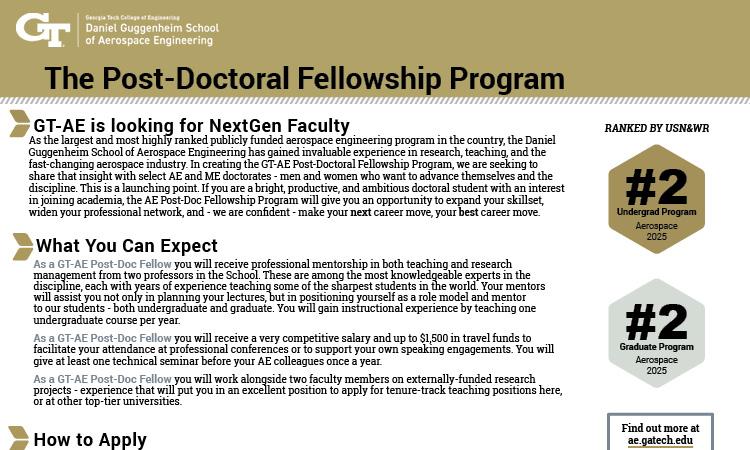 As the largest and most highly ranked publicly-funded aerospace engineering program in the country, the Daniel Guggenheim School of Aerospace Engineering has gained invaluable experience in research, teaching, and the fast-changing aerospace industry. In creating the AE Post-Doctoral Fellowship Program, we are seeking to share that insight with select AE and ME doctorates - individuals who want to advance themselves and the discipline.