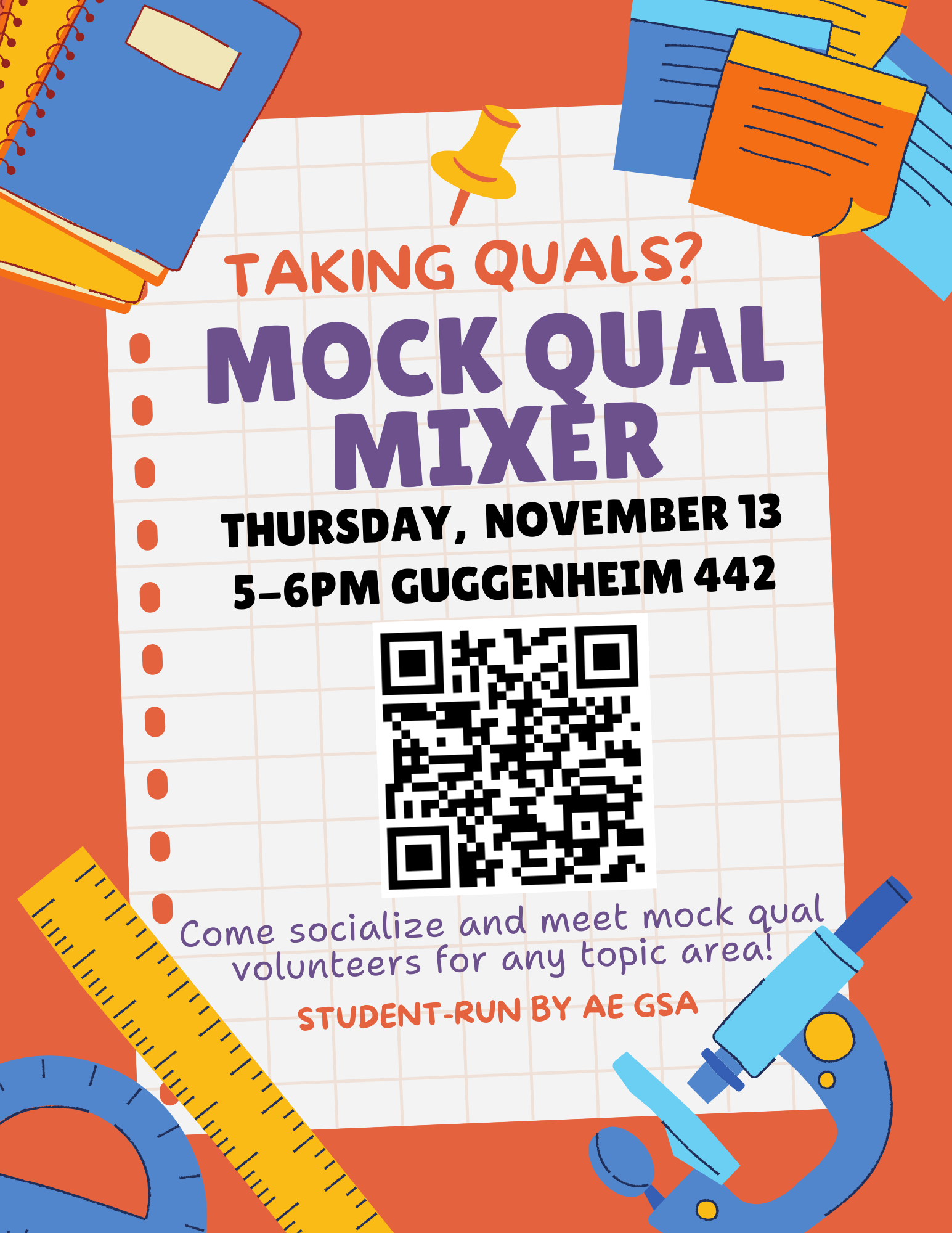 On Thursday November 13th, AE GSA will be hosting a Mock Qual Mixer to facilitate students finding mock qual volunteers from 5-6PM in Guggenheim 442. This event is a social mixer intended to provide the opportunity to schedule mocks for a later time. We're looking for volunteers to give mock quals to attend this event to support our peers. (If you cannot attend but would be willing to give mock quals, please RSVP so that we can contact you.)