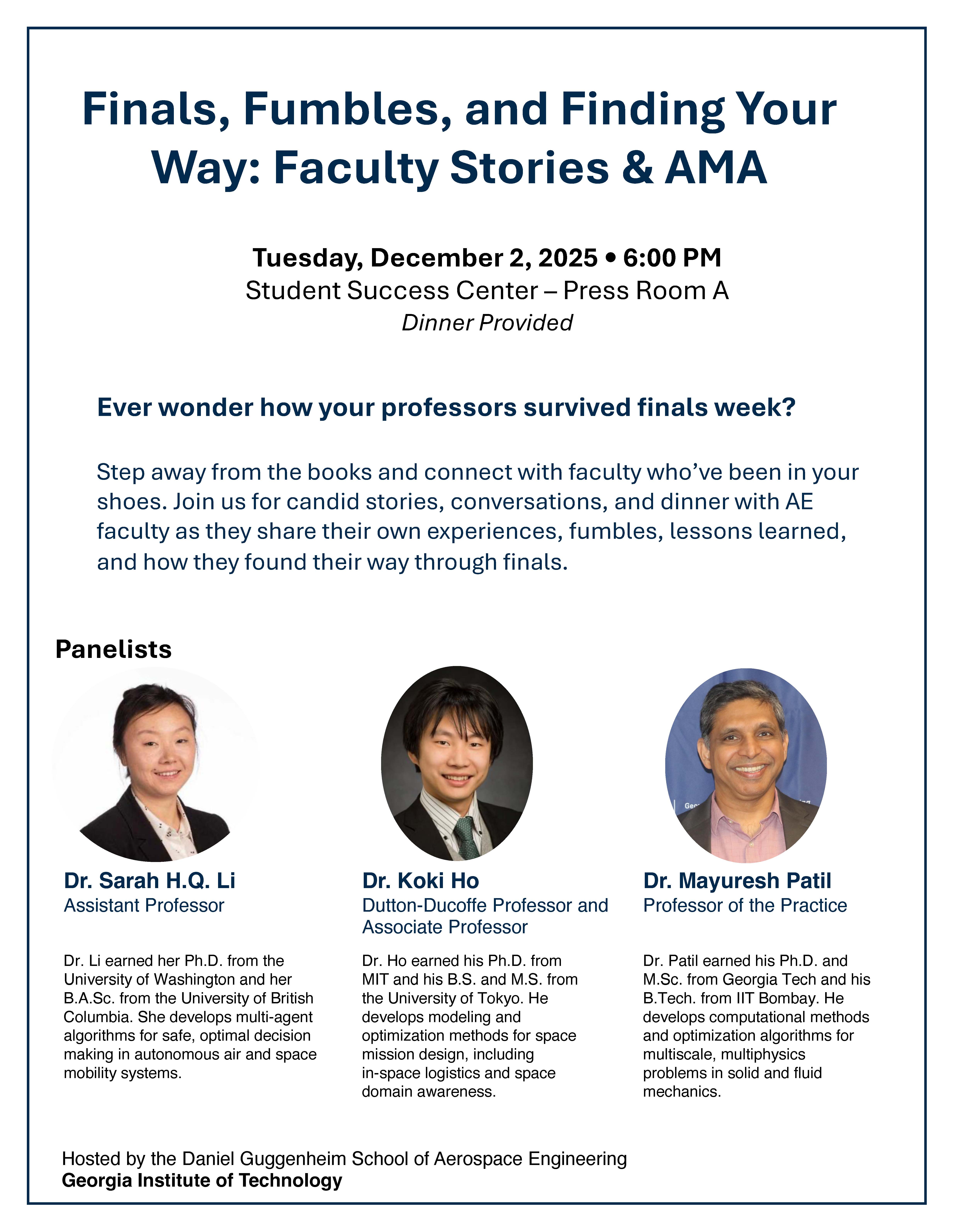 Take a break from studying and join us for candid stories, conversations, and dinner with AE faculty as they share their own experiences, fumbles, lessons learned, and how they found their way.