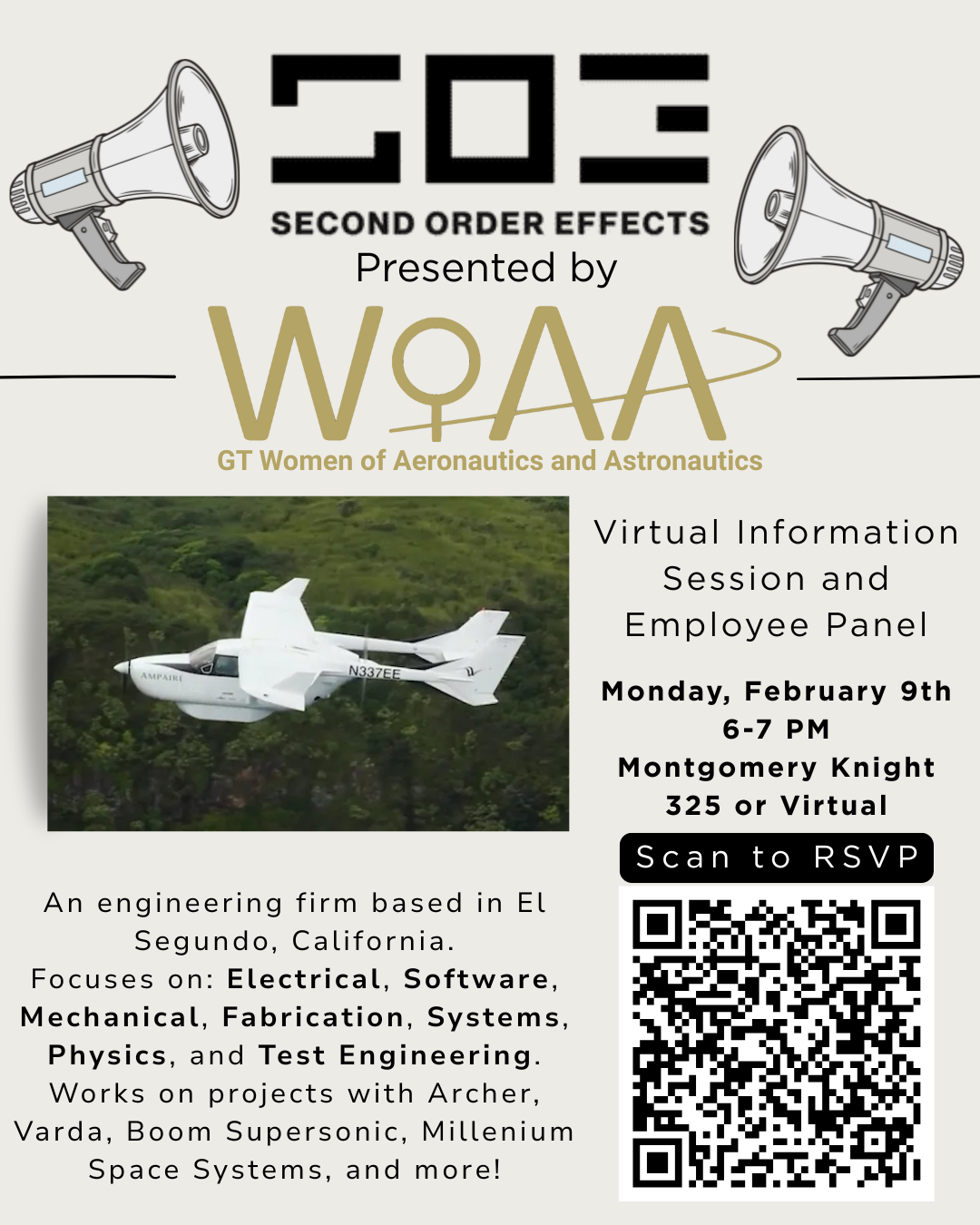 GT Women of Aeronautics and Astronautics will be hosting a virtual information session and employee panel with Second Order Effects. Tune in in-person at Montgomery Knight 325 or virtually at 6 PM on Monday, February 9th. Second Order Effects is an engineering research and development firm based in El Segundo, California, that specializes in custom electronics and end-to-end electronic systems. They develop cross-disciplined solutions and products to help solve some of the world’s most difficult problems by optimizing solutions beyond the first order. They work with aerospace companies such as Varda, Archer, Boom Supersonic, Millennium Space Systems, and many more! To receive the link to join the meeting, make sure to RSVP with this form