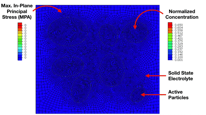 ![]() Preliminary Simulation of a Composite Cathode Material Microstructure Using a Solid State Electrolyte. We can notice the development of high stresses in the solid electrolyte matrix which ultimately lead to interfacial damage and decohesion of the active particles. This has important implications for the electrochemical performance of the electrode. |