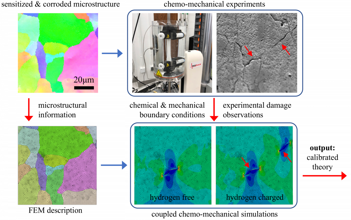 Proposed Combined Experimental and Theoretical Study of Environmental Induced Corrosion. Experimentally exact microstructures are being modeled using a chemo-mechanical framework to capture the manner in which hydrogen distributes in these microstructures and leads to damage.