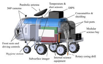 | The surface habitat (S-Hab) is a pressurized mobile habitat of 14m2 in floor area with a retractable design and folding wheels. |
