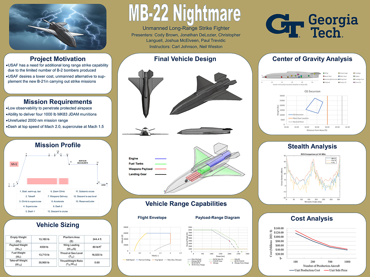 “We had a lot of really great lectures throughout the semester from Carl and Neil, which gave us tons of information that we brought together in a multidisciplinary way to make sacrifices and compromises in different parts of the aircraft to make other parts as good as they needed to be to find the overall balance in the design process,” said DeLozier.